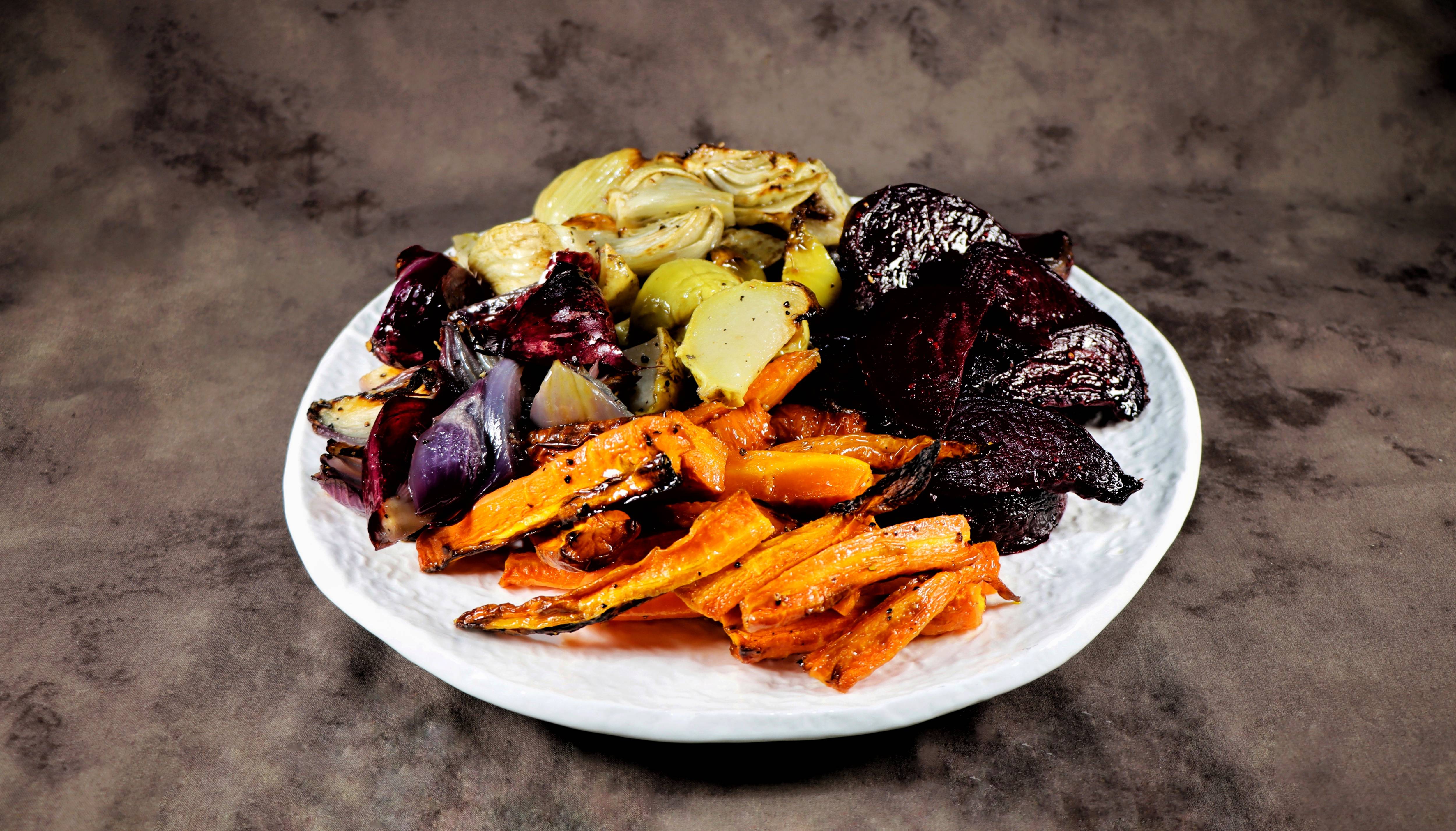 ירקות שורש צלויים, גזר, שומר, קולורבי, בצל וסלק
